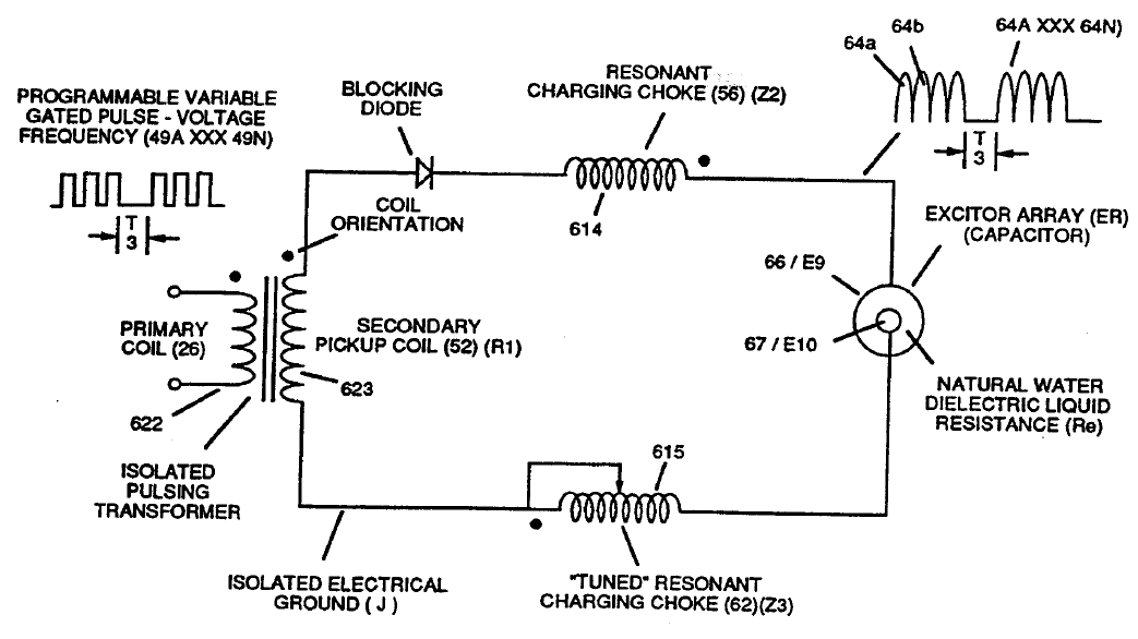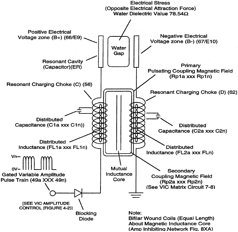 Two resonant coils are placed on either side of the water capacitor. The water acts as the dielectric medium between two voltage zones. By tuning the circuit to the dielectric characteristics of water we create a pulsing resonance condition.