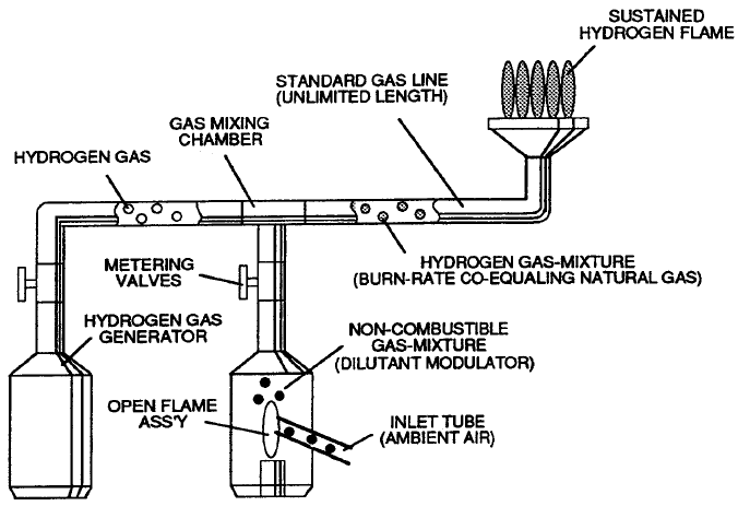 - A system for slowing hydrogen’s burn rate by mixing controlled amounts of non-combustible gases with the hydrogen before ignition.