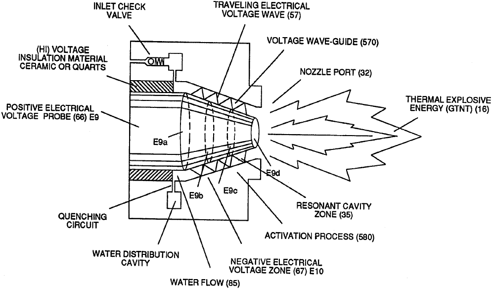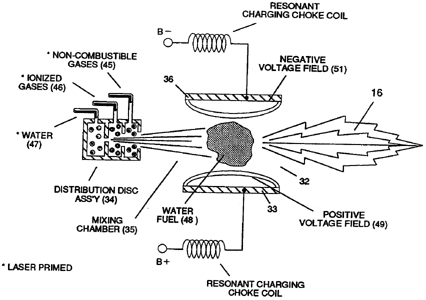 The injector exposes water to high voltage pulses inside a resonant cavity. This stretches the water molecule under electrical stress before ignition occurs.