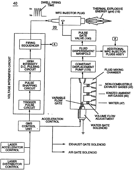 Water is meter-mixed into the injector, exposed to high voltage pulses, and the resulting energy release powers the engine.